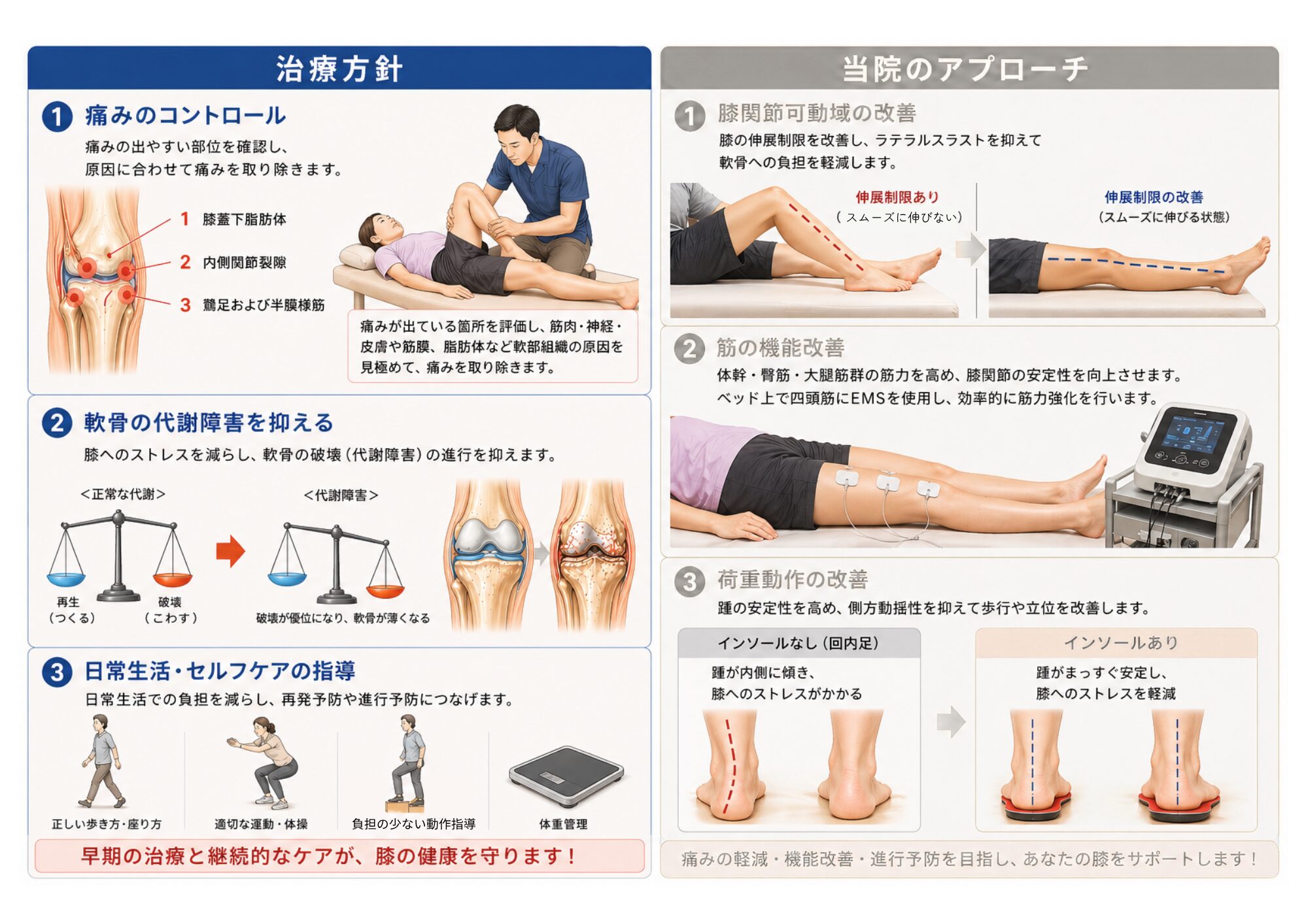 当院では膝関節に加わるストレスを減らし代謝障害を抑えるように施術、リハビリを行います。