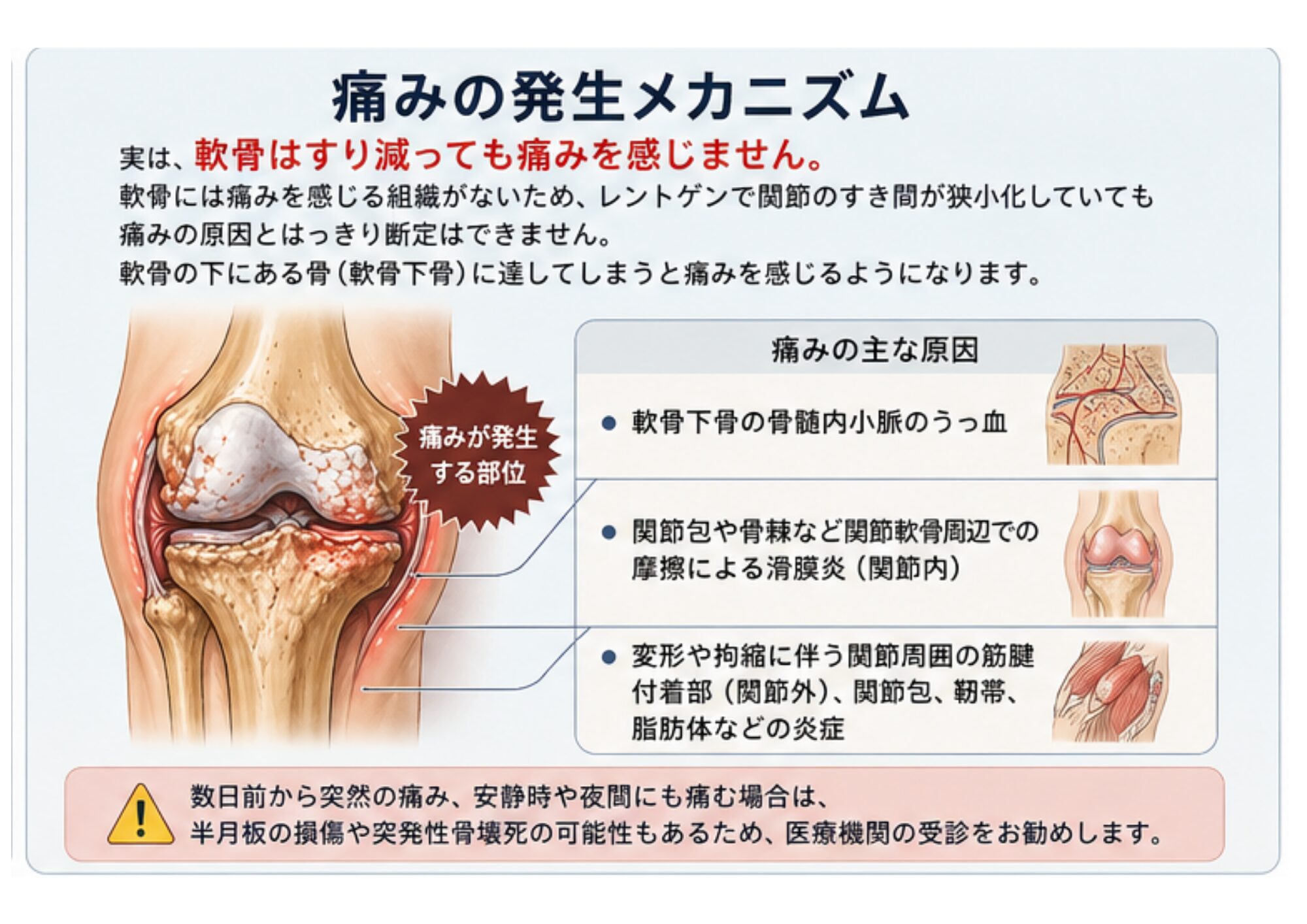 突然膝の痛みが発生し安静時/夜間時にも痛みを訴える場合、